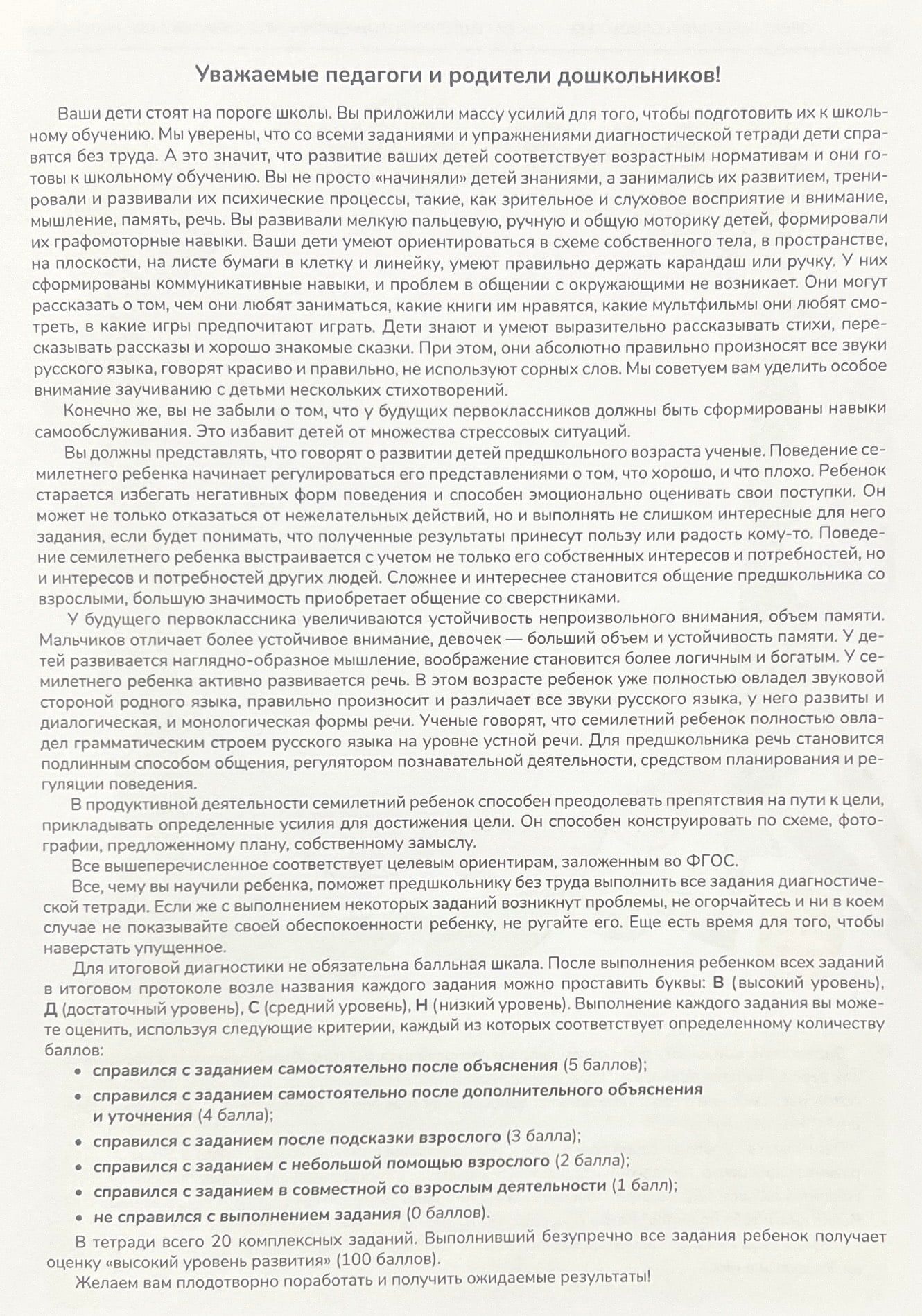 Диагностическая тетрадь содержит материалы для итоговой диагностики развития дошкольника семилетнего возраста. Она позволяет определить, вышел ли ребенок на целевые ориентиры, узнать, насколько предшкольник готов к школьному обучению. В тетради представлены упражнения и задания, которые ребенок может выполнить самостоятельно, практически без помощи взрослого после объяснения каждого задания.