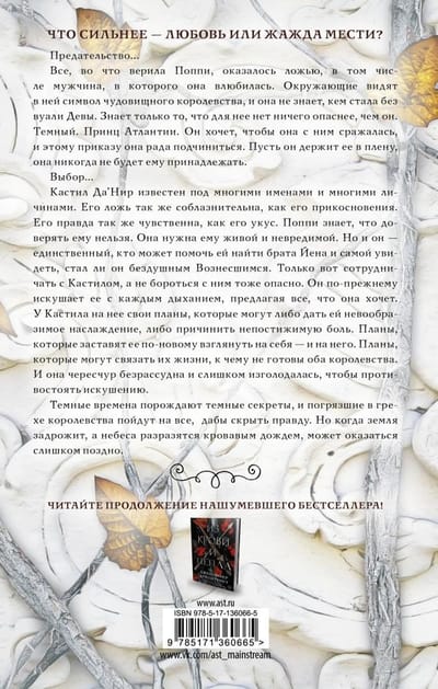 Кастил Да’Нир известен под многими именами и многими личинами. Его ложь так же соблазнительна, как его прикосновения. Его правда так же чувственна, как его укус. Поппи знает, что доверять ему нельзя. Она нужна ему живой и невредимой. Но и он — единственный, кто может помочь ей найти брата Йена и самой увидеть, стал ли он бездушным Вознесшимся. Только вот сотрудничать с Кастилом, а не бороться с ним тоже опасно. Он по‑прежнему искушает ее с каждым дыханием, предлагая все, что она хочет. У Кастила на нее свои планы, которые могут либо дать ей невообразимое наслаждение, либо причинить непостижимую боль. Планы, которые заставят ее по‑новому взглянуть на себя — и на него. Планы, которые могут связать их жизни, к чему не готовы оба королевства. И она чересчур безрассудна и слишком изголодалась, чтобы противостоять искушению. Темные времена порождают темные секреты, и погрязшие в грехе королевства пойдут на все, дабы скрыть правду. Но когда земля задрожит, а небеса разразятся кровавым дождем, может оказаться слишком поздно. Читайте продолжение нашумевшего бестселлера!