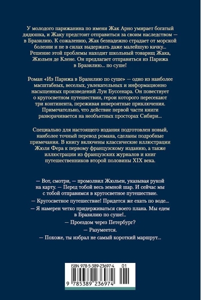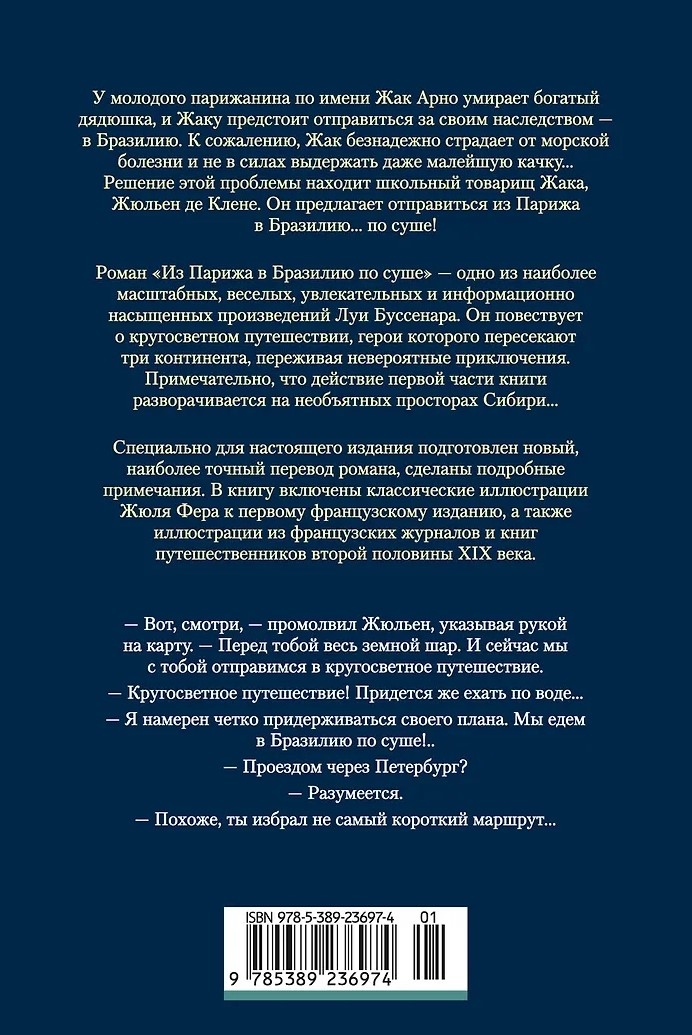 Роман «Из Парижа в Бразилию по суше» — одно из наиболее масштабных, веселых, увлекательных и информационно насыщенных произведений Луи Буссенара. Он повествует о кругосветном путешествии, герои которого пересекают три континента, переживая невероятные приключения. Примечательно, что действие первой части книги разворачивается на необъятных просторах Сибири…