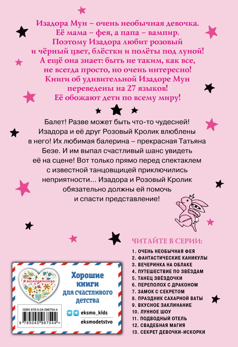 Изадора и её лучший друг Розовый Кролик обожают балет! Красивая музыка, великолепные костюмы и, конечно, талантливые танцовщики! И однажды друзьям повезло оказаться на спектакле с участием великолепной Татьяны Безе, любимой балерины Изадоры! Но, к сожалению, прямо перед выступлением Татьяна подвернула ногу. Неужели спектакль сорвётся?! Как бы не так! Ведь Изадора Мун никогда и никого не оставит в беде!