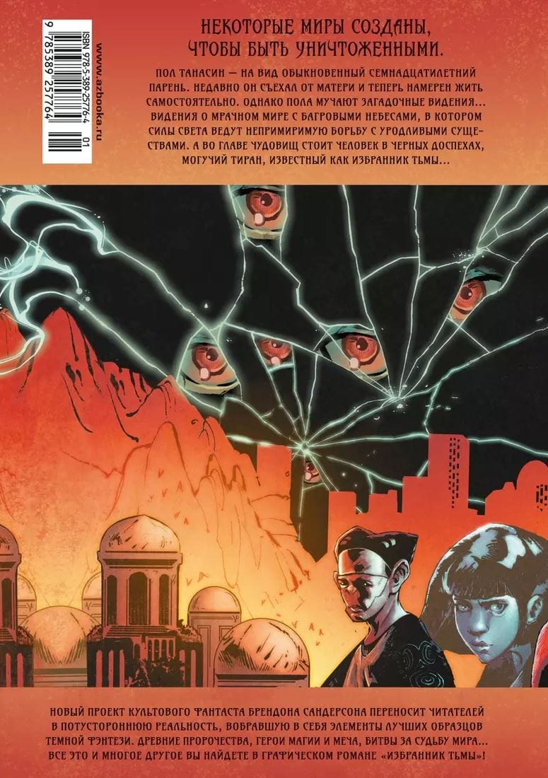 Пол Танасин — на вид обыкновенный семнадцатилетний парень. Недавно он съехал от матери и теперь намерен жить самостоятельно. Однако Пола мучают загадочные видения... Видения о мрачном мире с багровыми небесами, в котором силы света ведут непримиримую борьбу с уродливыми существами. А во главе чудовищ стоит человек в черных доспехах, могучий тиран, известный как Избранник Тьмы. Пол пытается выяснить, почему его преследуют эти навязчивые образы, однако правда, которая открывается юноше, переворачивает его непримечательную жизнь с ног на голову... Новый проект культового фантаста Брендона Сандерсона переносит читателей в потустороннюю реальность, вобравшую в себя элементы лучших образцов темной фэнтези. Древние пророчества, герои магии и меча, битвы за судьбу мира... Все это и многое другое вы найдете в графическом романе «Избранник Тьмы».