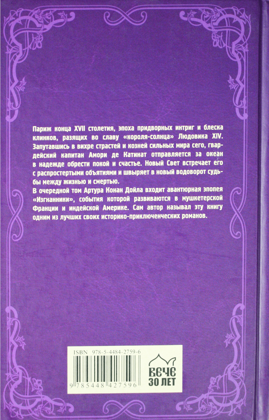 Париж конца XVII столетия, эпоха придворных интриг и блеска клинков, разящих во славу «короля-солнца» Людовика XIV. Запутавшись в вихре страстей и козней сильных мира сего, гвардейский капитан Амори де Катинат отправляется за океан в надежде обрести покой и счастье. Новый Свет встречает его с распростертыми объятиями и швыряет в новый водоворот судьбы между жизнью и смертью. В очередной том Артура Конан Дойла входит авантюрная эпопея «Изгнанники», события которой развиваются в мушкетерской Франции и индейской Америке. Сам автор называл эту книгу одним из лучших своих историко-приключенческих романов.