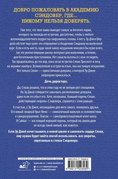Уже того, что твоя мама выходит замуж за богатого парня, которого ты никогда не встречал, достаточно, чтобы у любого восемнадцатилетнего подростка закружилась голова. А вот у Эр Джея Шоу дела обстоят еще хуже: его отправляют в Академию Сэндовер на выпускной курс. Если и есть место, куда такой хакер‑неудачник вписался бы хуже всего, так это увитая плющом школа‑интернат для мальчиков, а точнее, для богатеньких преступников. Нет смысла пытаться с кем‑то ладить. Так продолжалось до тех пор, пока он не встретил Слоан Тресскотт в лесу на окраине кампуса. Великолепная и острая на язык, она настоящее искушение. Вот только Слоан — единственная девушка, к которой Эр Джею запрещено прикасаться.