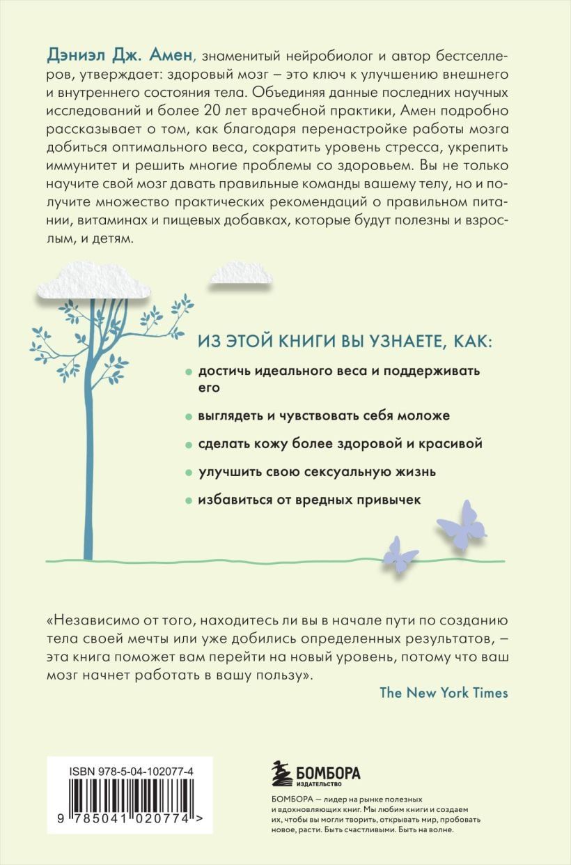 Дэниэл Дж. Амен, знаменитый нейробиолог и автор бестселлеров, утверждает: здоровый мозг — это ключ к улучшению внешнего и внутреннего состояния тела. Объединяя данные последних научных исследований и более 20 лет врачебной практики, Амен подробно рассказывает о том, как благодаря перенастройке работы мозга добиться оптимального веса, сократить уровень стресса, укрепить иммунитет и решить многие проблемы со здоровьем. Вы не только научите свой мозг давать правильные команды вашему телу, но и получите множество практических рекомендаций о правильном питании, витаминах и пищевых добавках, которые будут полезны и взрослым, и детям.