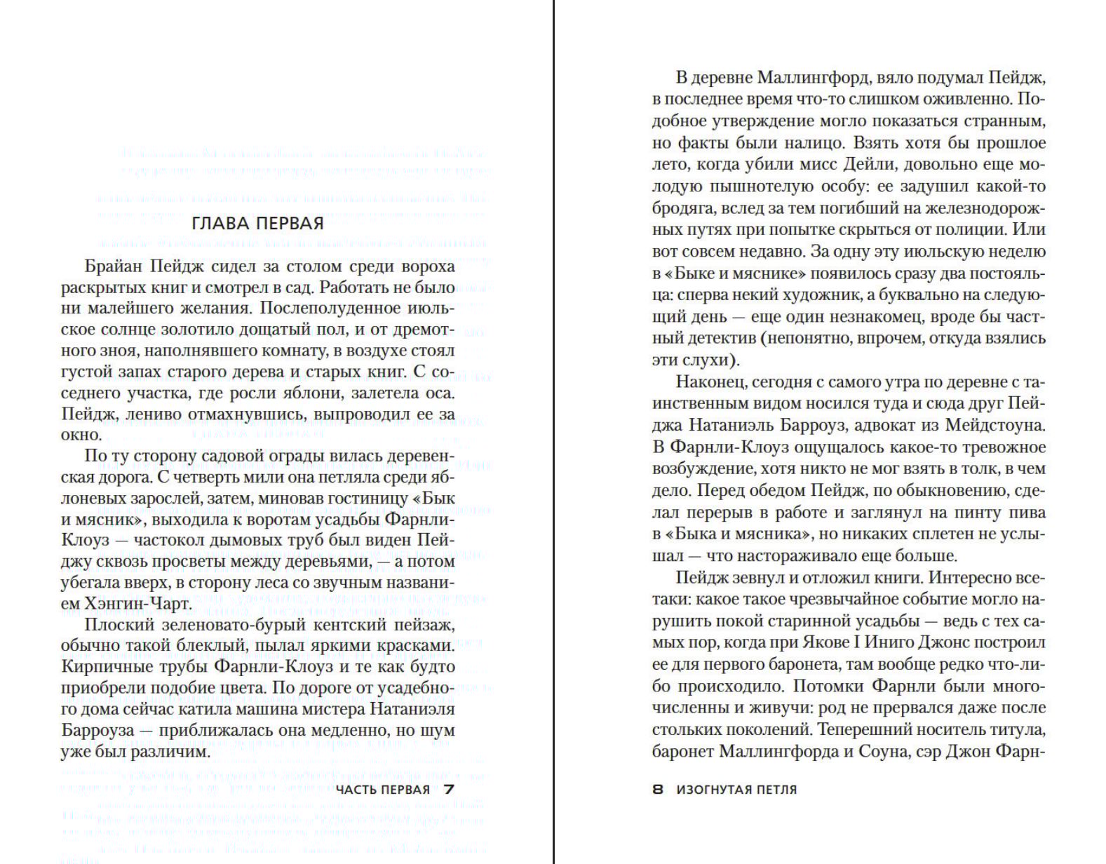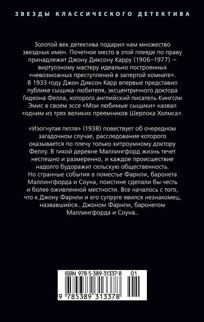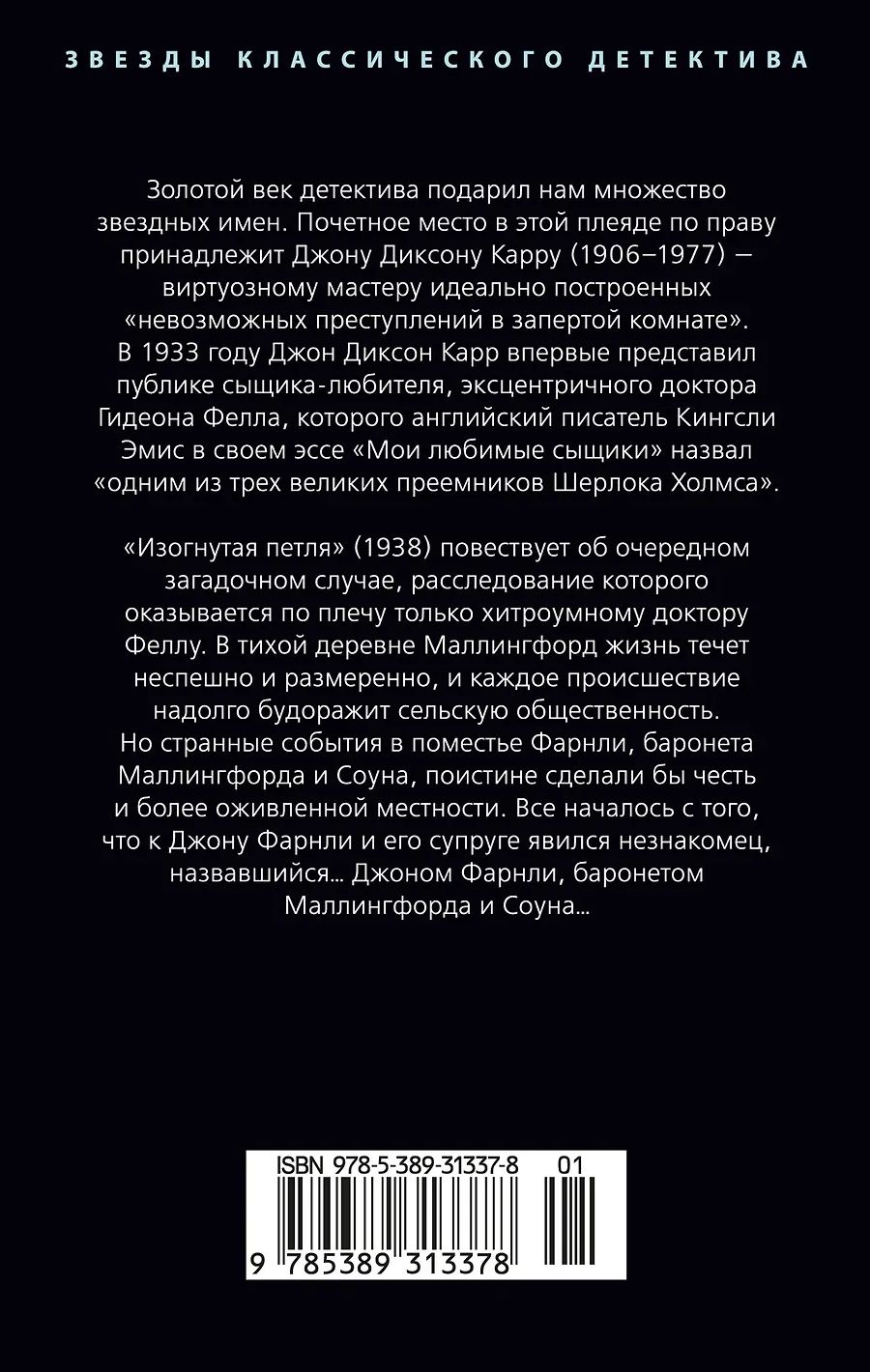 «Изогнутая петля» (1938) повествует об очередном загадочном случае, расследование которого оказывается по плечу только хитроумному доктору Феллу. В тихой деревне Маллингфорд жизнь течет неспешно и размеренно, и каждое происшествие надолго будоражит сельскую общественность. Но странные события в поместье Фарнли, баронета Маллингфорда и Соуна, поистине сделали бы честь и более оживленной местности. Все началось с того, что к Джону Фарнли и его супруге явился незнакомец, назвавшийся… Джоном Фарнли, баронетом Маллингфорда и Соуна…