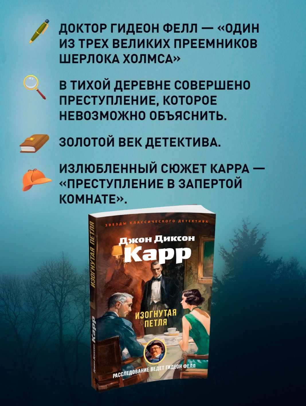 Золотой век детектива подарил нам множество звездных имен. Почетное место в этой плеяде по праву принадлежит Джону Диксону Карру (1906–1977) — виртуозному мастеру идеально построенных «невозможных преступлений в запертой комнате». В 1933 году Джон Диксон Карр впервые представил публике сыщика-любителя, эксцентричного доктора Гидеона Фелла, которого английский писатель Кингсли Эмис в своем эссе «Мои любимые сыщики» назвал «одним из трех великих преемников Шерлока Холмса».