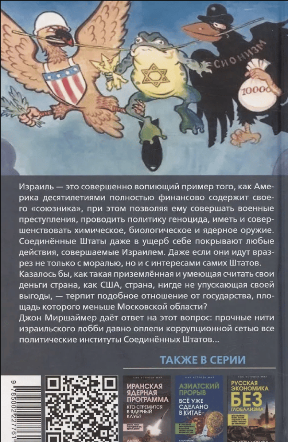 Израиль — это совершенно вопиющий пример того, как Америка десятилетиями полностью финансово содержит своего «союзника», при этом позволяя ему совершать военные преступления, проводить политику геноцида, иметь и совершенствовать химическое, биологическое и ядерное оружие. Соединённые Штаты даже в ущерб себе покрывают любые действия, совершаемые Израилем. Даже если они идут вразрез не только с моралью, но и с интересами самих Штатов. Казалось бы, как такая приземлённая и умеющая считать свои деньги страна, как США, страна, нигде не упускающая своей выгоды, — терпит подобное отношение от государства, площадь которого меньше Московской области? Миршаймер даёт ответ на этот вопрос: прочные нити израильского лобби давно оплели коррупционной сетью все политические институты Соединённых Штатов...