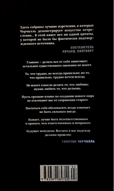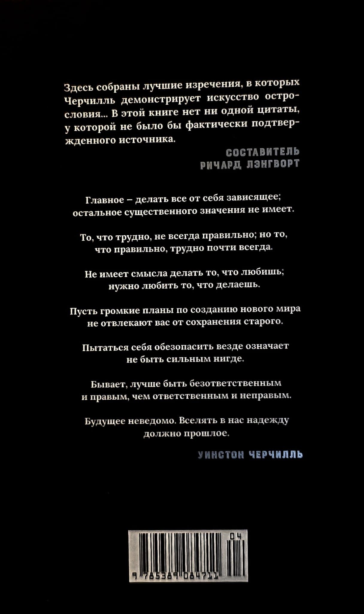 В эту книгу вошли не только широко известные изречения Уинстона Черчилля, но и его небольшие философские притчи, а также полная сарказма полемика с политическими деятелями его времени. Большой интерес для читателей представляет раздел, где собраны афоризмы, приписываемые Черчиллю, — как, например, переходящая из уст в уста знаменитая фраза «…демократия — худшая форма правления, если не считать всех остальных, к которым до сих пор прибегало человечество».