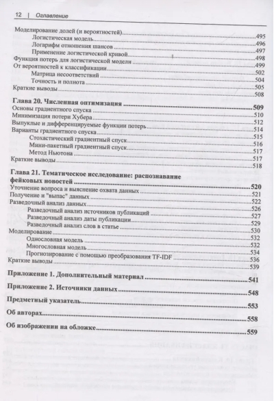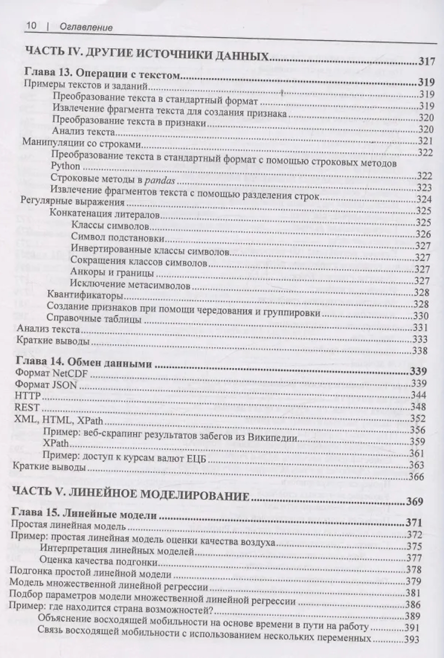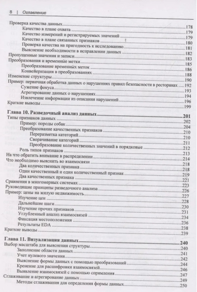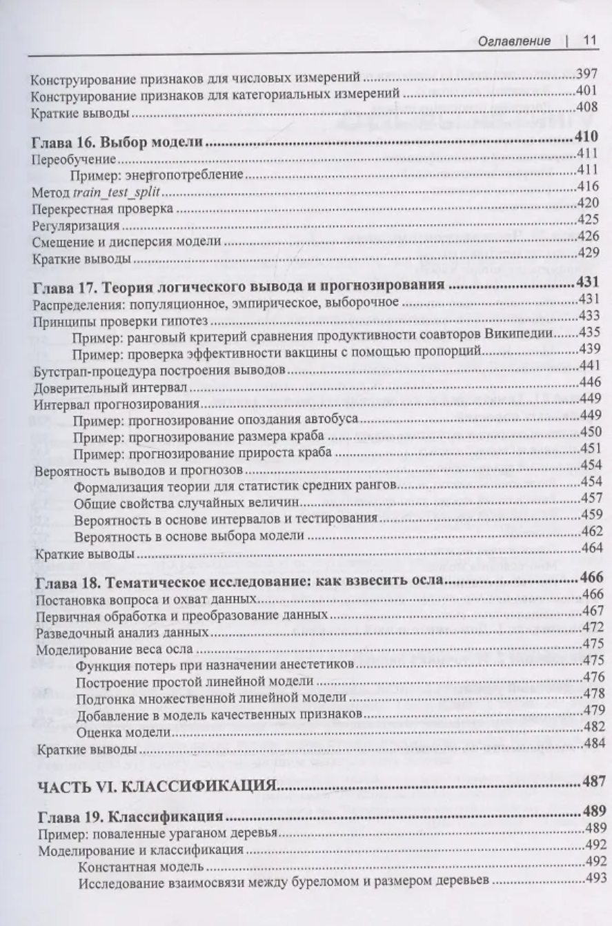 Практическое руководство по анализу данных, раскрывающее полный цикл работы с информацией: от сбора и обработки до построения моделей машинного обучения. Рассмотрена работа с инструментами pandas и SQL, методы выявления закономерностей и очистки данных. Описаны различные источники информации, включая текстовые, бинарные и веб-данные. Подробно изложены статистические методы: доверительные интервалы, проверка гипотез, конструирование признаков. Приведены практические примеры на языке Python из разных областей: анализ транспортных систем, экологические исследования, ветеринарная аналити-ка. Заключительные разделы посвящены логистической регрессии и оптимизации моделей с применением к задачам классификации текстов.
