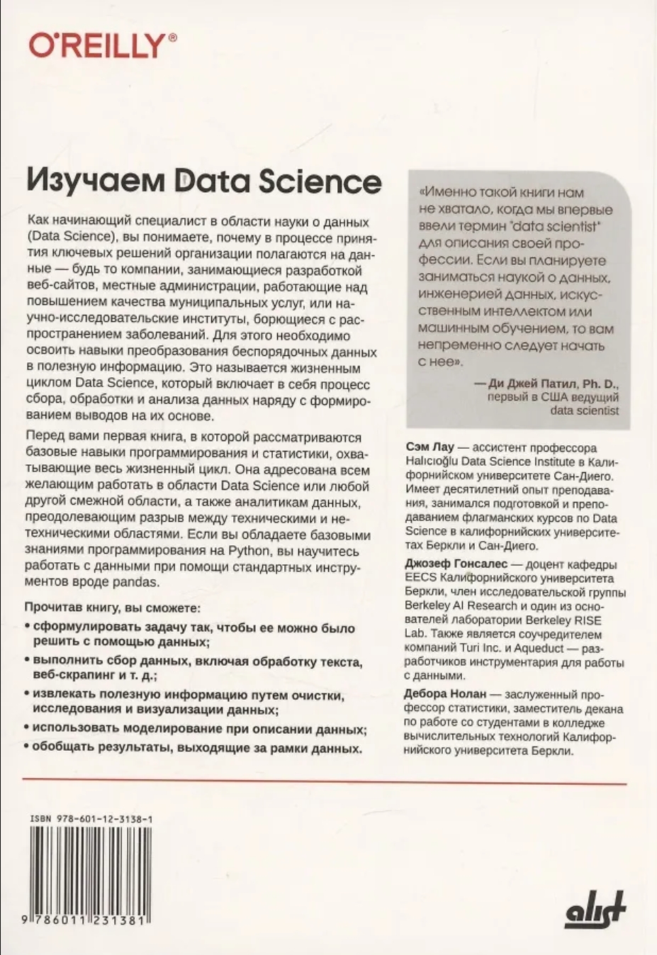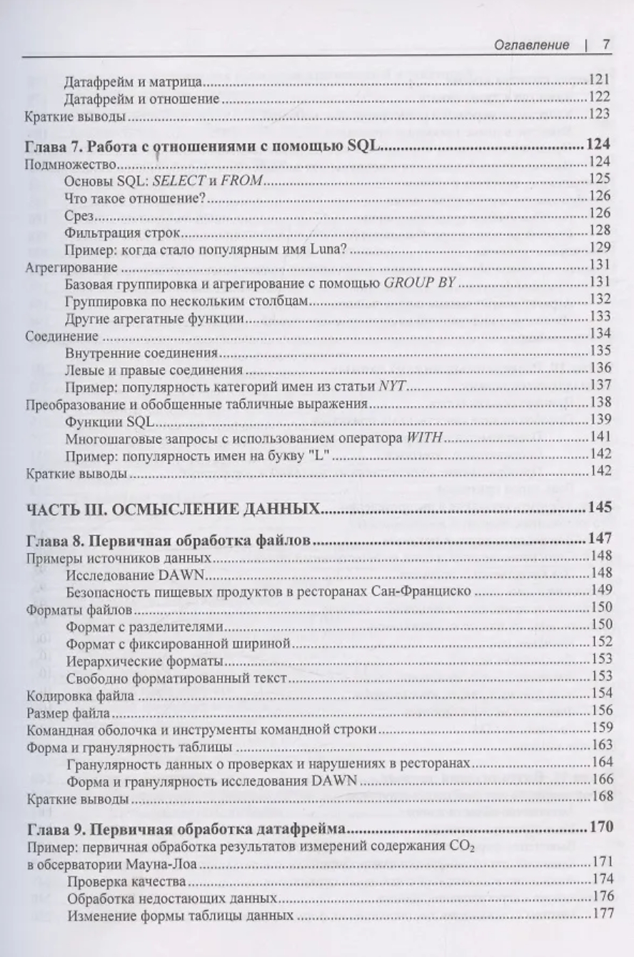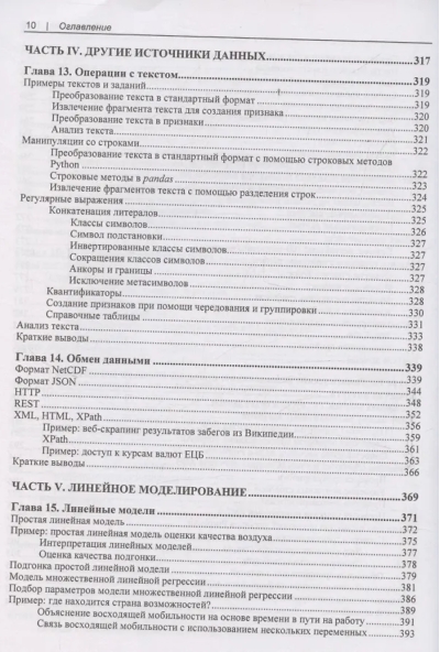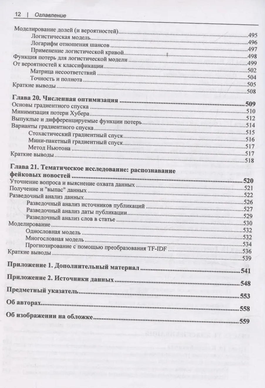 Практическое руководство по анализу данных, раскрывающее полный цикл работы с информацией: от сбора и обработки до построения моделей машинного обучения. Рассмотрена работа с инструментами pandas и SQL, методы выявления закономерностей и очистки данных. Описаны различные источники информации, включая текстовые, бинарные и веб-данные. Подробно изложены статистические методы: доверительные интервалы, проверка гипотез, конструирование признаков. Приведены практические примеры на языке Python из разных областей: анализ транспортных систем, экологические исследования, ветеринарная аналити-ка. Заключительные разделы посвящены логистической регрессии и оптимизации моделей с применением к задачам классификации текстов.