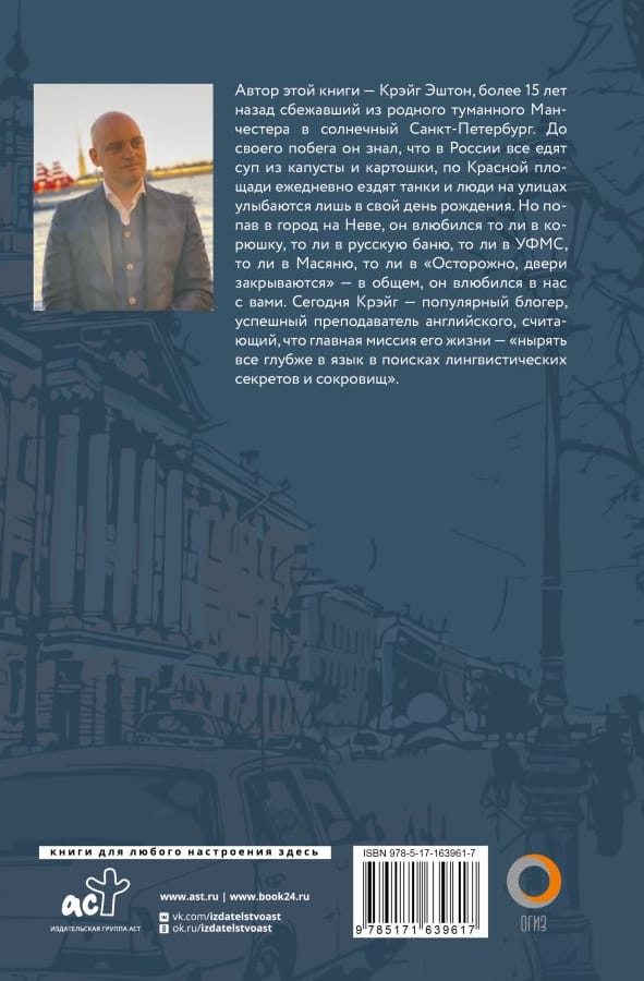 Автор этой книги — Крэйг Эштон, более 15 лет назад сбежавший из родного туманного Манчестера в солнечный Санкт-Петербург. До своего побега он знал, что в России все едят суп из капусты и картошки, по Красной площади ежедневно ездят танки, и люди на улицах улыбаются лишь в свой день рождения. Но попав в город на Неве, он влюбился то ли в корюшку, то ли в русскую баню, то ли в УФМС, то ли в Масяню, то ли в «Осторожно, двери закрываются» — в общем, он влюбился в нас с вами. Сегодня Крэйг — популярный блогер, успешный преподаватель английского, считающий, что главная миссия его жизни — «нырять все глубже в язык в поисках лингвистических секретов и сокровищ».