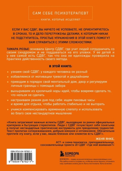 Смягчите проявления СДВГ с помощью авторского метода психотерапевта Тамары Розье. На примерах реальных клиентов из практики автора вы увидите, что СДВГ у всех проявляется по-разному и не всегда в точности соответствует официальным критериям. Вы увидите плюсы и минусы, которые дает вам СДВГ, и работая по авторской методике со своим воображением и убеждениями, измените свое отношение к нему.