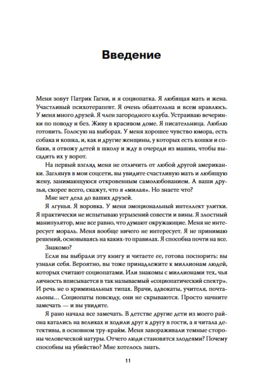 Патрик Гагни уже в детском саду поняла, что отличается от других. Эмоции, которые чувствовали другие дети, словно ускользали от нее — страх, чувство вины, сочувствие. Она не ощущала ничего. Долгое время Патрик притворялась, что она такая же, как все, но это было невыносимо. В колледже она, наконец, убедилась в том, что давно подозревала — она социопатка.