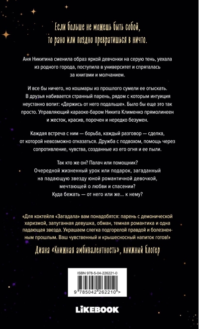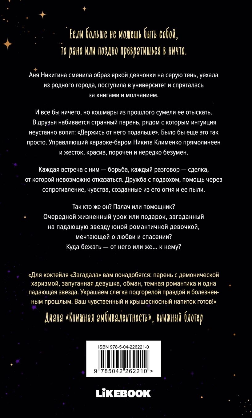 Аня Никитина сменила образ яркой девчонки на серую тень, уехала из родного города, поступила в университет и спряталась за книгами и молчанием. И все бы ничего, но кошмары из прошлого сумели ее отыскать. В друзья набивается странный парень, рядом с которым интуиция неустанно вопит: «Держись от него подальше». Было бы еще это так просто. Управляющий караоке-бара Никита Клименко прямолинеен и жесток, красив, порочен и нередко безумен. Каждая встреча с ним — борьба, каждый разговор — сделка, от которой невозможно отказаться. Дружба с подвохом, помощь через сопротивление, чувства, созданные из его огня и ее пыли.