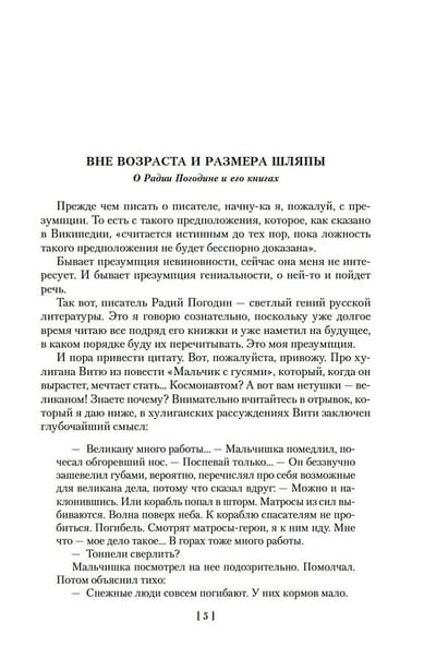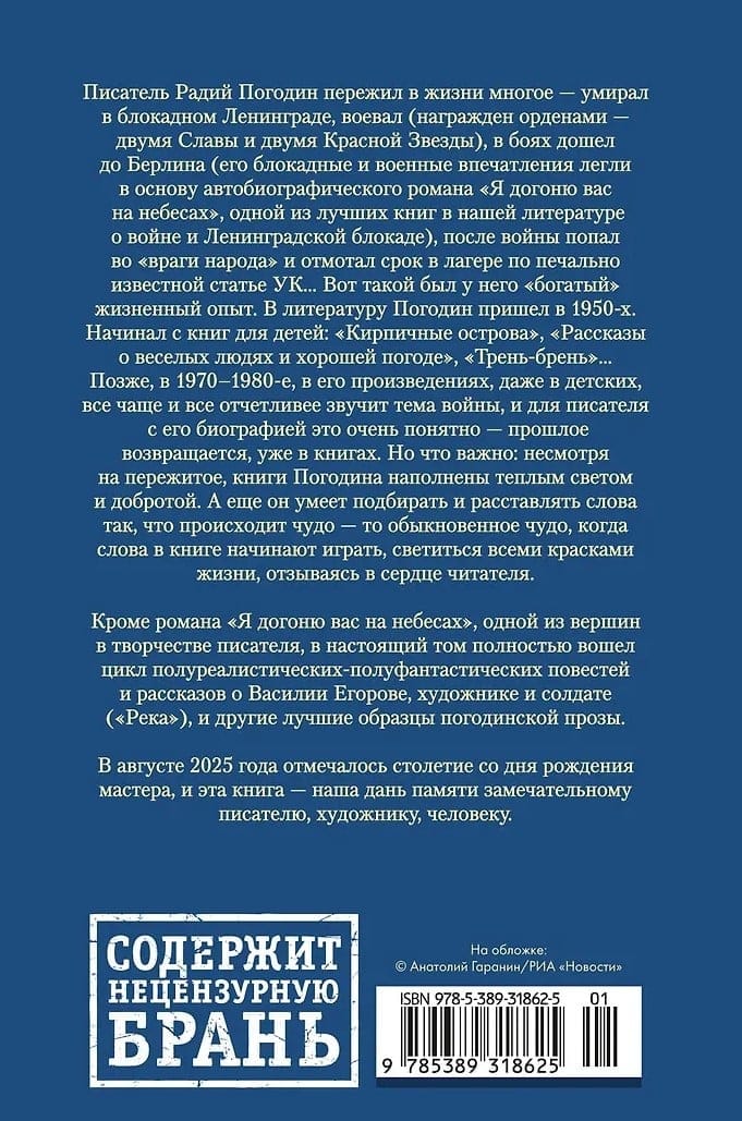 Писатель Радий Погодин пережил в жизни многое — умирал в блокадном Ленинграде, воевал (награжден орденами — двумя Славы и двумя Красной Звезды), в боях дошел до Берлина (его блокадные и военные впечатления легли в основу автобиографического романа «Я догоню вас на небесах», одной из лучших книг в нашей литературе о войне и Ленинградской блокаде), после войны попал во «враги народа» и отмотал срок в лагере по печально известной статье УК… Вот такой был у него «богатый» жизненный опыт. В литературу Погодин пришел в 1950-х. Начинал с книг для детей: «Кирпичные острова», «Рассказы о веселых людях и хорошей погоде», «Трень-брень»… Позже, в 1970–1980-е, в его произведениях, даже в детских, все чаще и все отчетливее звучит тема войны, и для писателя с его биографией это очень понятно — прошлое возвращается, уже в книгах. Но что важно: несмотря на пережитое, книги Погодина наполнены теплым светом и добротой. А еще он умеет подбирать и расставлять слова так, что происходит чудо — то обыкновенное чудо, когда слова в книге начинают играть, светиться всеми красками жизни, отзываясь в сердце читателя.