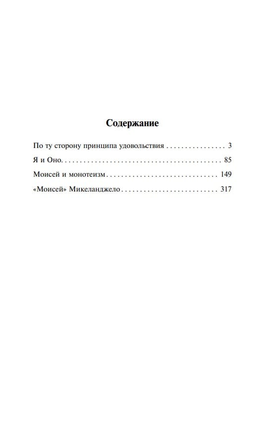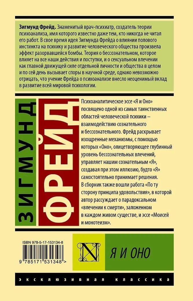 Психоаналитическое эссе «Я и Оно» посвящено одной из самых таинственных областей человеческой психики – взаимодействию сознательного и бессознательного. Фрейд раскрывает изощренные механизмы, с помощью которых «Оно», олицетворяющее глубинный уровень бессознательных влечений, управляет нашим сознательным «Я», создавая при этом иллюзию, будто «Я» самостоятельно принимает решения. В сборник также вошли работа «По ту сторону принципа удовольствия», в которой автор рассуждает о парадоксальном «влечении к смерти», заложенном в каждом живом существе, и эссе «Моисей и монотеизм».