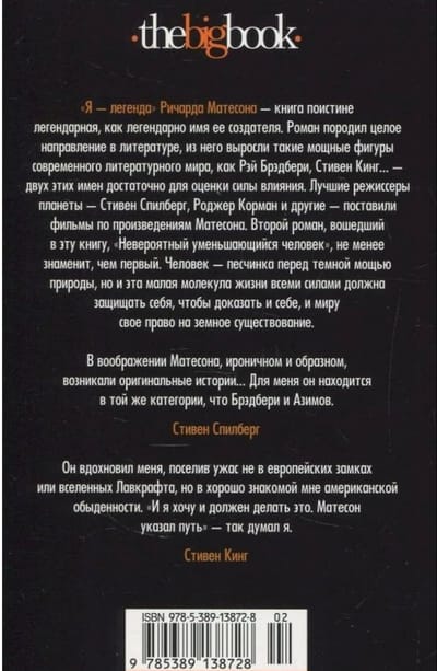 «Я — легенда» Ричарда Матесона — книга поистине легендарная как легендарно имя ее создателя. Роман породил целое направление в литературе, из него выросли такие мощные фигуры современного литературного мира как Рэй Брэдбери, Стивен Кинг… — двух этих имен достаточно для оценки силы влияния. Лучшие режиссеры планеты — Стивен Спилберг, Роджер Корман и другие — поставили фильмы по произведениям Матесона. Второй роман, вошедший в эту книгу, «Невероятный уменьшающийся человек», не менее знаменит, чем первый. Человек — песчинка перед темной мощью природы, но и эта малая молекула жизни всеми силами должна защищать себя, чтобы доказать и себе и миру свое право на земное существование.