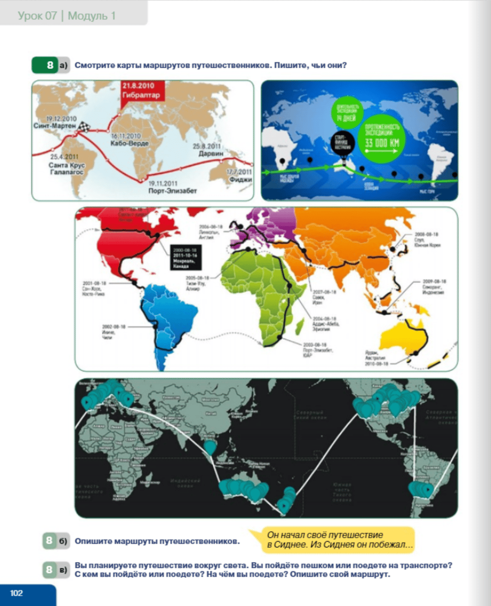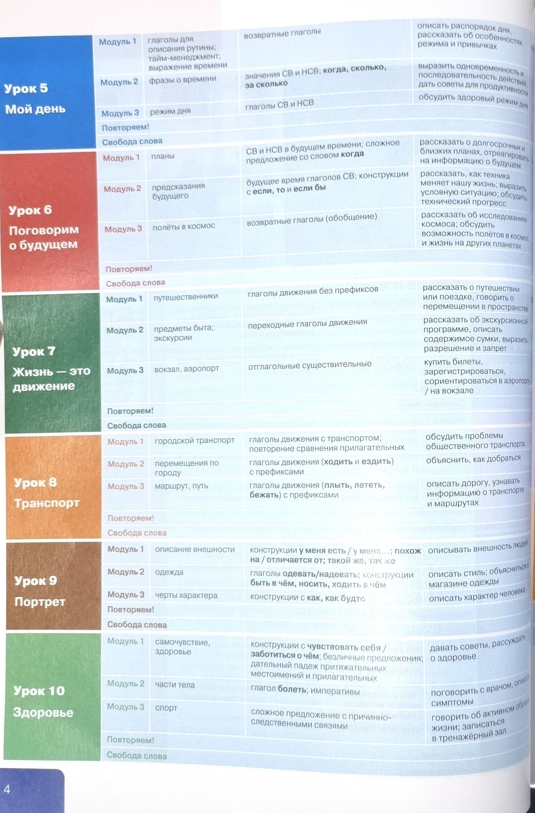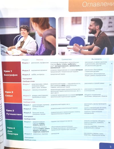 Фундаментальная грамматика, такая как виды глагола или глаголы движения, вводятся в коммуникативной форме посредством диалогов, визуальных образов, текстов и инфографики.