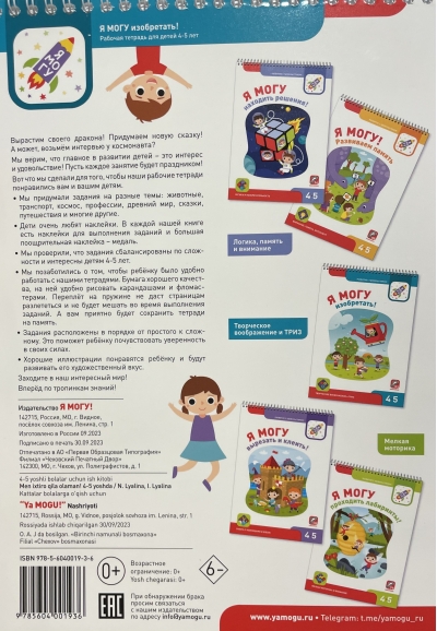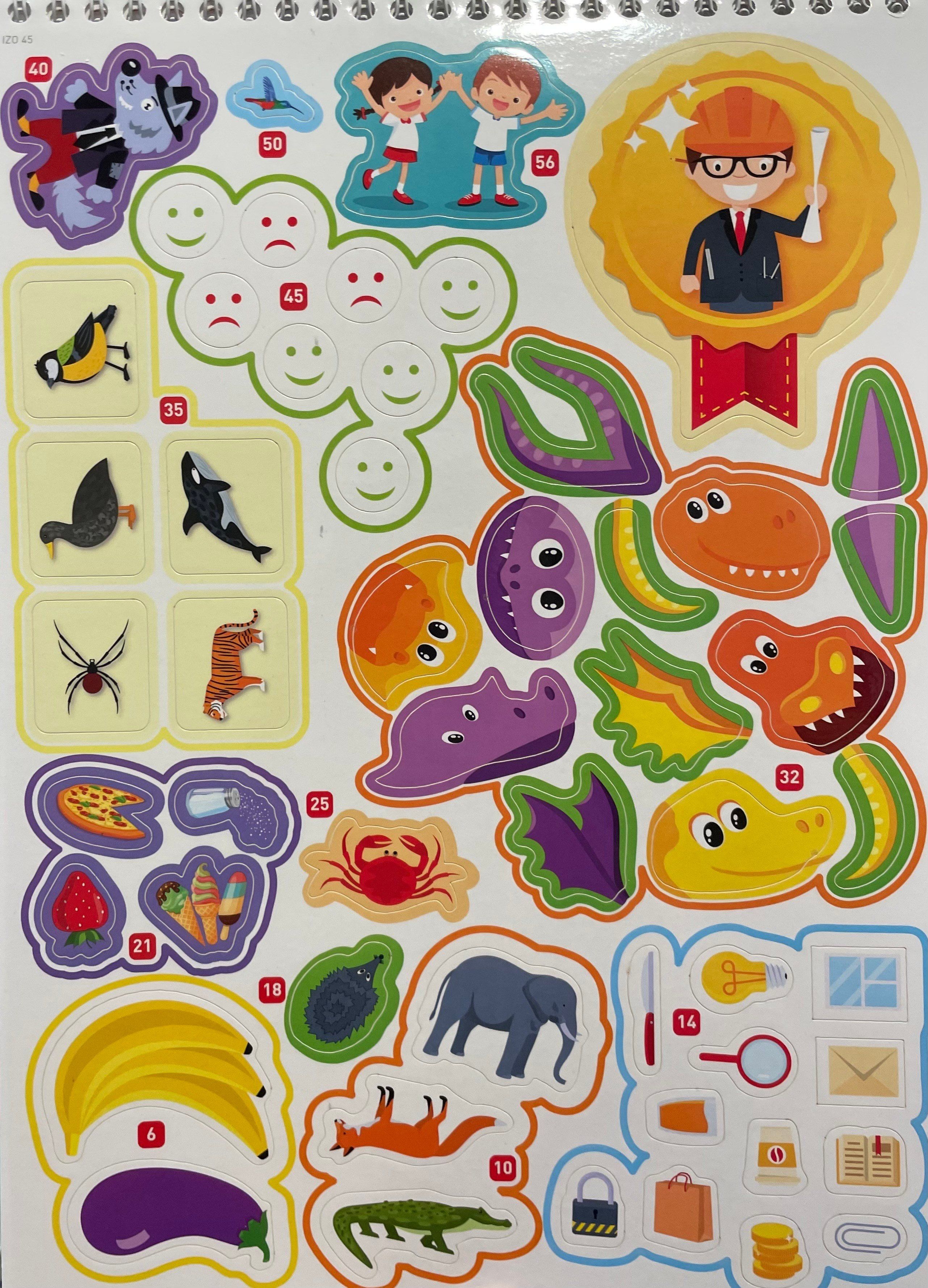 В тетради есть лист с 53 наклейками, которые так нравятся детям. Заламинированные многоразовые наклейки можно переклеивать, не боясь их порвать. Пособия серии «Я могу!» напечатаны на специально подобранной плотной бумаге, с которой ребёнку будет удобно работать. Все тетради имеют переплёт на пружине, который не даст страницам разлететься и не будет мешать во время выполнения заданий.