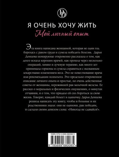 Эта книга написана женщиной, которая не один год боролась с раком груди и сумела победить болезнь. Дарья Донцова шокирующе откровенно рассказала о том, как долго искала хороших врачей, как прошла через несколько операций, химию и лучевую терапию, как много лет принимала гормоны и сумела справиться с вызванным лекарствами изменением веса. Это не повествование врача или рекомендации психолога. Это предельно откровенное описание личного опыта и простые, но очень действенные советы от женщины, пережившей рак молочной железы. Ее рассказ о моральных и физических ощущениях, о минутах отчаяния, и о том, что придало ей сил бороться за свою жизнь. Говорят, каждый болеет в одиночку. Дарья Донцова решила написать эту книгу, чтобы и больные и их родственники знали: они не одиноки, рак победим, и сделали своим девизом слова: «Никогда не сдавайся!».