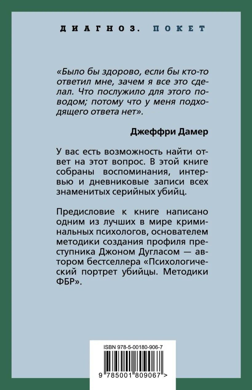 «Было бы здорово, если бы кто-то ответил мне, зачем я все это сделал. Что послужило для этого поводом; потому что у меня подходящего ответа нет». — Джеффри Дамер У вас есть возможность найти ответ на этот вопрос. В этой книге собраны воспоминания, интервью и дневниковые записи всех знаменитых серийных убийц. Предисловие к книге написано одним из лучших криминальных психологов в мире, основателем методики создания профиля преступника Джоном Дугласом — автором бестселлера...