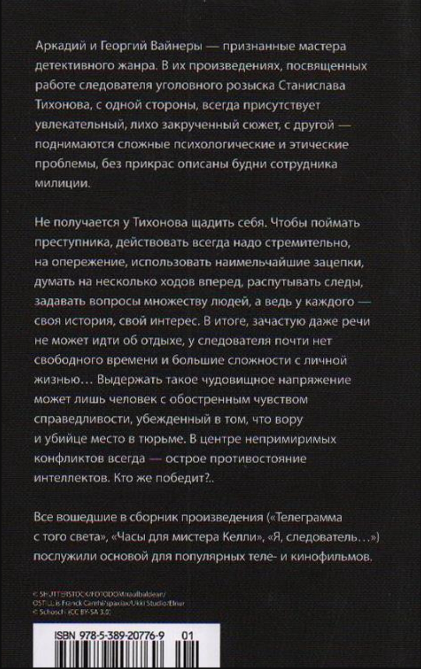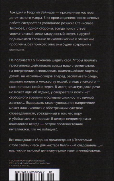 Аркадий и Георгий Вайнеры — признанные мастера детективного жанра. В их произведениях, посвященных работе следователя уголовного розыска Станислава Тихонова, с одной стороны, всегда присутствует увлекательный, лихо закрученный сюжет, с другой — поднимаются сложные психологические и этические проблемы, без прикрас описаны будни сотрудника милиции.