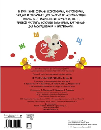 В этой книге собраны скороговорки, чистоговорки, загадки и считалочки для занятий по автоматизации правильного произношения звуков Ж, Ш, Щ. Речевой материал дополнен заданиями, картинками для раскрашивания и наклейками.