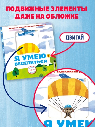 Игра с книгой начинается прямо с обложки, ведь там находится первая подвижная деталь! Яркие простые картинки с весёлыми животными обязательно заинтересуют ребёнка, а интерактивные элементы сделают игру с книгой ещё увлекательнее. Рассматривайте картинки с малышом и придумывайте свои истории!