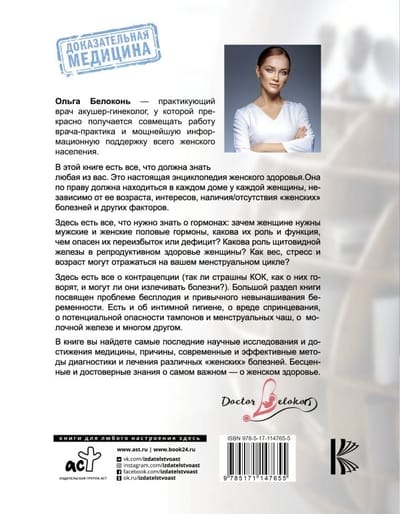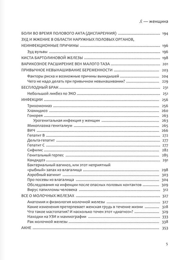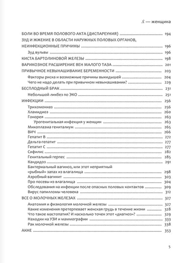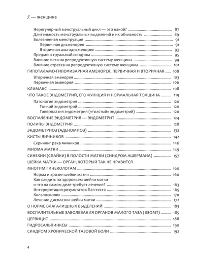 В этой книге есть все, что должна знать любая из вас. Это настоящая энциклопедия женского здоровья. Она по праву должна находиться в каждом доме у каждой женщины, независимо от ее возраста, интересов, наличия/отсутствия «женских» болезней и других факторов. Здесь есть все, что нужно знать о гормонах: зачем женщине нужны мужские и женские половые гормоны, какова их роль и функция, чем опасен их переизбыток или дефицит? Какова роль щитовидной железы в репродуктивном здоровье женщины? Как вес, стресс и возраст могут отражаться на вашем менструальном цикле? Здесь есть все о контрацепции (так ли страшны КОК, как о них говорят, и могут ли они излечивать болезни?). Большой раздел книги посвящен проблеме бесплодия и привычного невынашивания беременности. Есть и об интимной гигиене, о вреде спринцевания, о потенциальной опасности тампонов и менструальных чаш, о молочной железе и многом другом. В книге вы найдете самые последние научные исследования и достижения медицины, причины, современные и эффективные методы диагностики и лечения различных «женских» болезней. Бесценные и достоверные знания о самом важном — о женском здоровье.