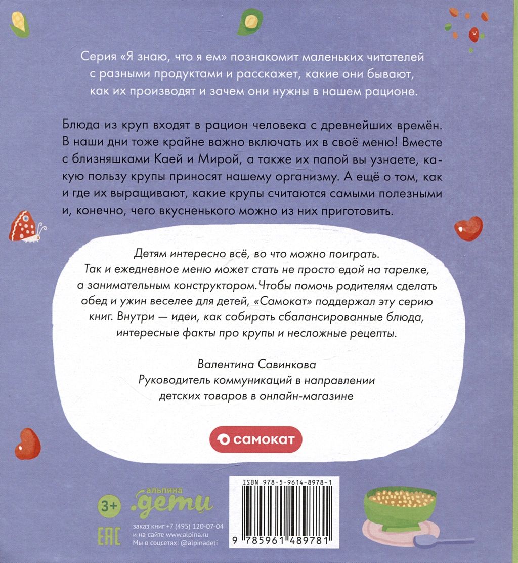 Серия «Я знаю, что я ем» познакомит маленьких читателей с различными продуктами и расскажет, какие они бывают, как их производят и зачем они нужны в нашем рационе. Ребенок получит ответы на свои вопросы о том, почему какую-то еду нужно есть обязательно, а чем-то лучше не злоупотреблять, и тем самым начнет формировать правильные пищевые привычки с раннего возраста. А еще в книге есть несложные рецепты очень вкусных блюд, которые можно приготовить вместе с родителями.