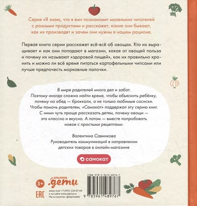 Первая книга серии «Я знаю, что я ем» расскажет все-все об овощах. Какие они бывают, кто их выращивает и как они попадают в магазин, какая от овощей польза и почему их называют «здоровой пищей», как их правильно хранить и можно ли все время питаться картофельными чипсами или лучше предпочесть морковные палочки.