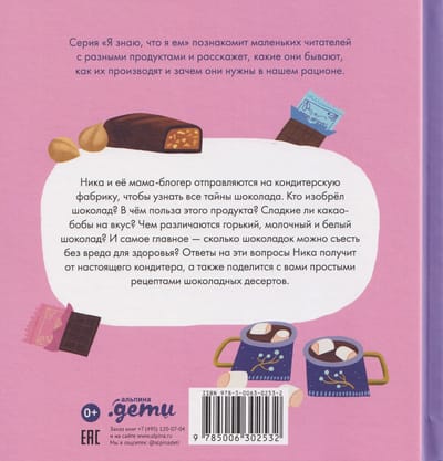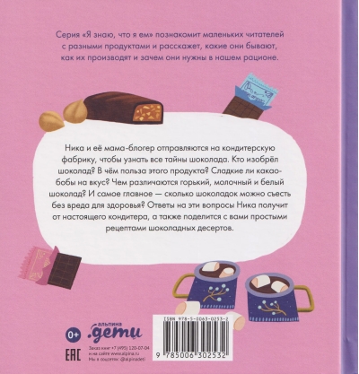Ника и её мама-блогер отправляются на кондитерскую фабрику, чтобы узнать все тайны шоколада. Кто изобрёл шоколад? В чём польза этого продукта? Сладкие ли какао-бобы на вкус? Чем различаются горький, молочный и белый шоколад? И самое главное — сколько шоколадок можно съесть без вреда для здоровья? Ответы на эти вопросы Ника получит от настоящего кондитера, а также поделится с вами простыми рецептами шоколадных десертов.