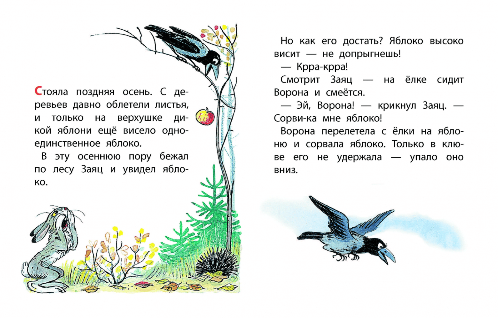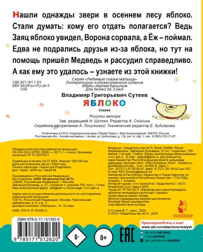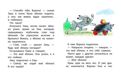 Нашли однажды звери в осеннем лесу яблоко. Стали думать: кому его отдать полагается? Ведь Заяц яблоко увидел, Ворона сорвала, а Ёж – поймал. Едва не подрались друзья из-за яблока, но тут на помощь пришёл Медведь и рассудил справедливо. А как ему это удалось – узнаете из этой книжки!
