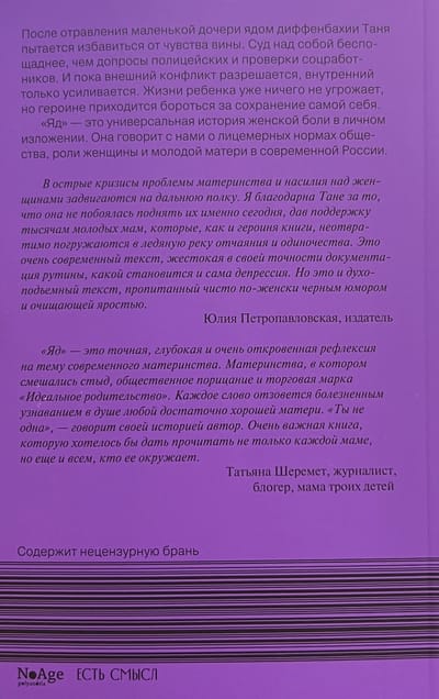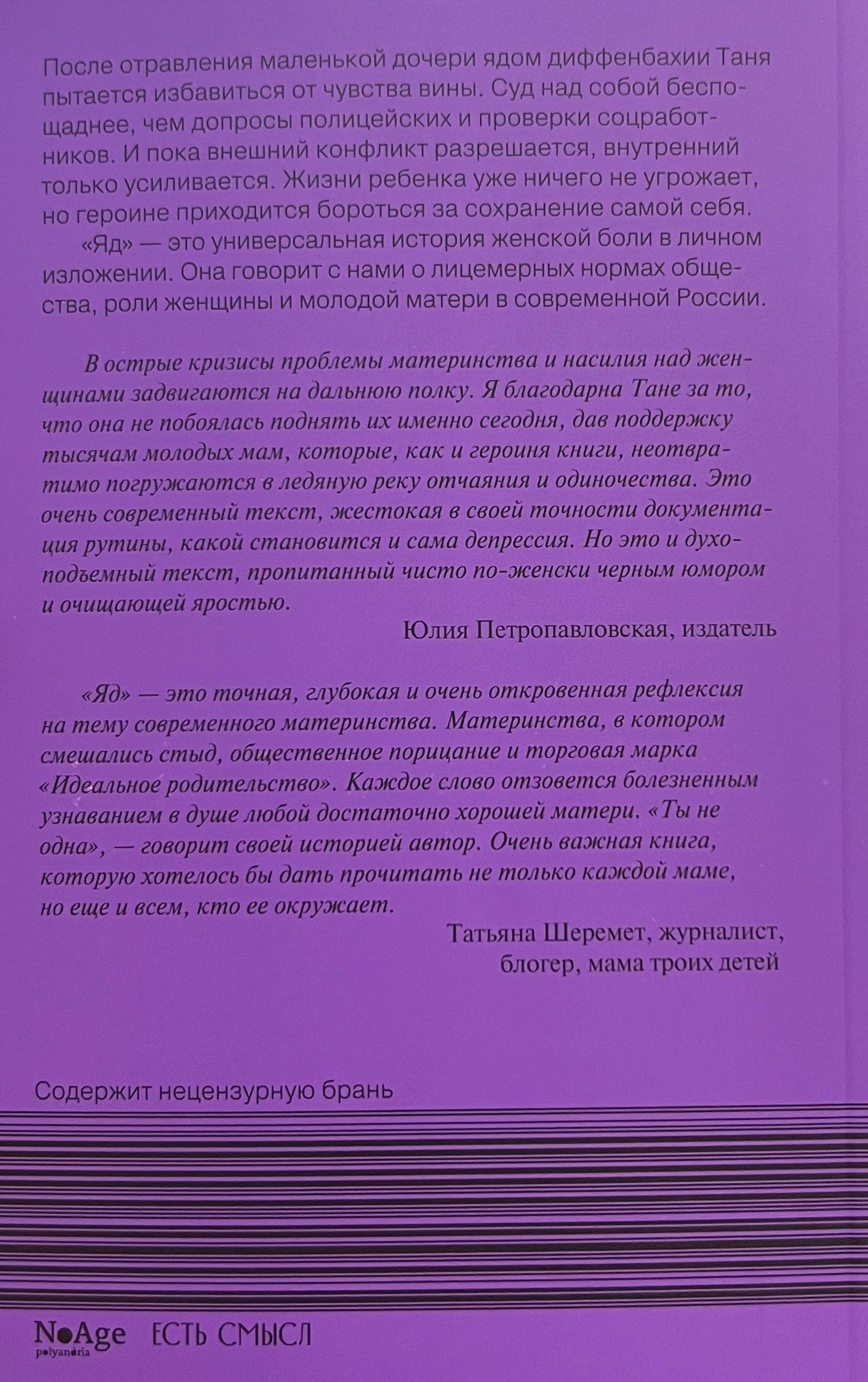 «Яд» — это точная, глубокая и очень откровенная рефлексия на тему современного материнства. Материнства, в котором смешались стыд, общественное порицание и торговая марка «Идеальное родительство». Каждое слово отзовется болезненным узнаванием в душе любой достаточно хорошей матери. «Ты не одна», — говорит своей историей автор. Очень важная книга, которую хотелось бы дать прочитать не только каждой маме, но еще и всем, кто ее окружает.