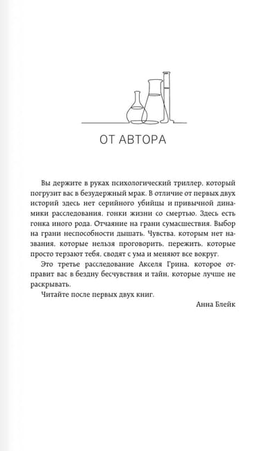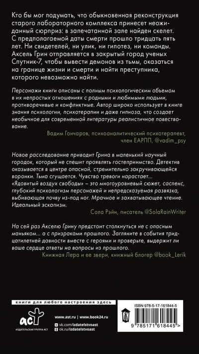 Кто бы мог подумать, что обыкновенная реконструкция старого лабораторного комплекса принесет неожиданный сюрприз: в запечатанной зале найден скелет. С предполагаемой даты смерти прошло тридцать пять лет. Ни свидетелей, ни улик, ни гипотез, ни команды. Аксель Грин отправляется в закрытый город ученых Спутник-7, чтобы вывести демонов из тьмы, оказаться на границе жизни и смерти и найти преступника, которого невозможно найти.