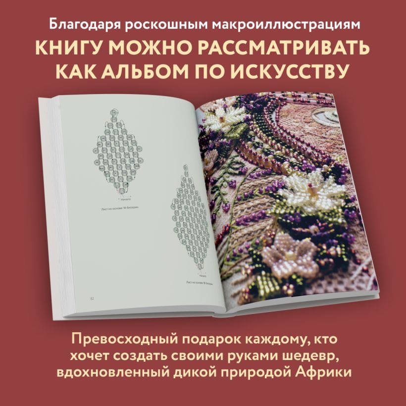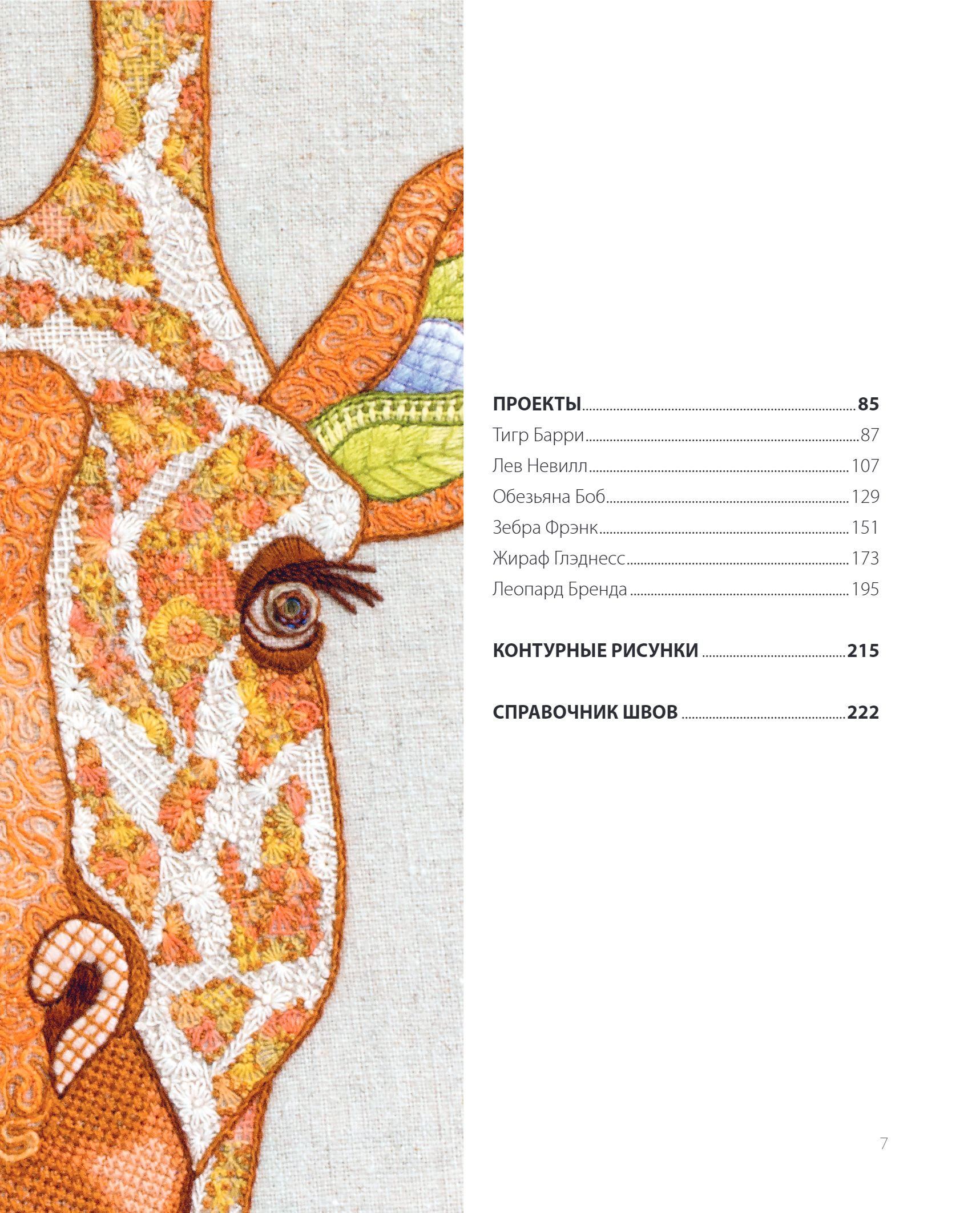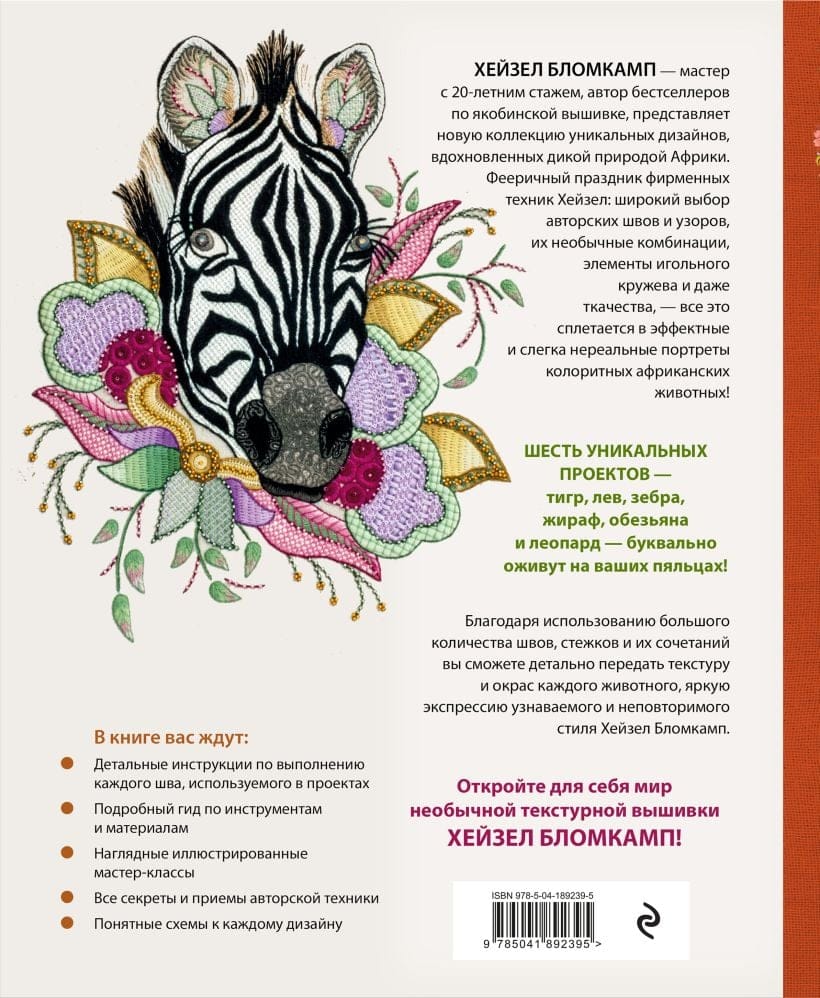Хейзел Бломкамп, мастер вышивки с 20-летним стажем, представляет новую коллекцию уникальных дизайнов, вдохновленных дикой природой Африки. Фееричный праздник фирменных техник Хейзел: широкий выбор авторских швов и узоров, их необычные комбинации, элементы игольного кружева и даже ткачества, — все это сплетается в эффектные и слегка нереальные портреты колоритных африканских животных! Шесть уникальных проектов — тигр, лев, зебра, жираф, обезьяна и леопард — буквально оживут на ваших пяльцах!