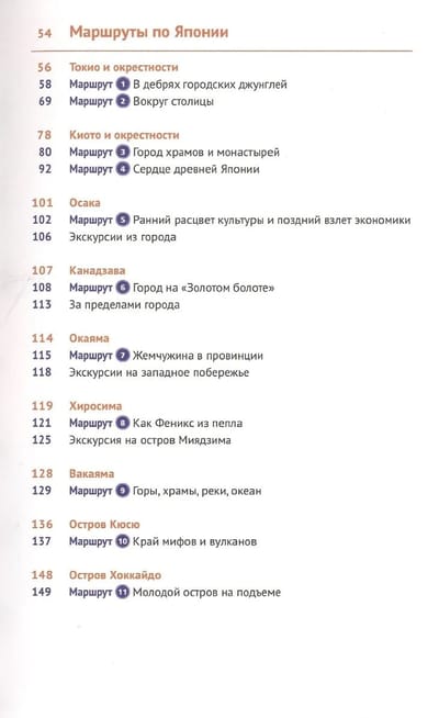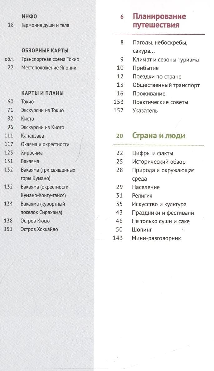 В путеводителе вы найдете разделы, которые помогут подготовиться к путешествию. Это краткая история страны, информация о транспортном сообщении, календарь предстоящих событий и праздников. Раздел климат поможет выбрать оптимальное для вас время для путешествия, а сведения о гостиницах и ресторанах - сориентироваться во всем многообразии предложений. Также в путеводителе представлены уникальные маршруты по разным городам и префектурам.