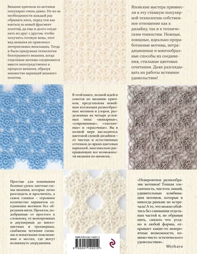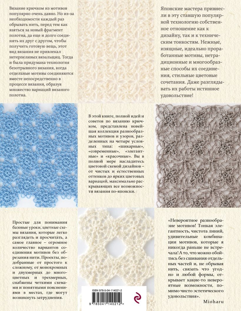 Новая большая коллекция узоров и мотивов для вязания крючком от лучших японских мастеров  не только порадует  всех ценителей японской эстетики, но и даст им в руки новый инструмент вязания из мотивов, позволяющий обойтись без обрыва нитей и нудного сшивания мотивов для получения цельного полотна. Множество инновационных способов соединения узоров непосредственно в процессе вязания открывает новые перспективы в вязании крючком нежных, изящных, визуально сложных изделий с уникальной фактурой полотна!