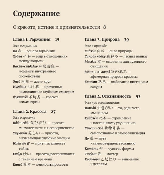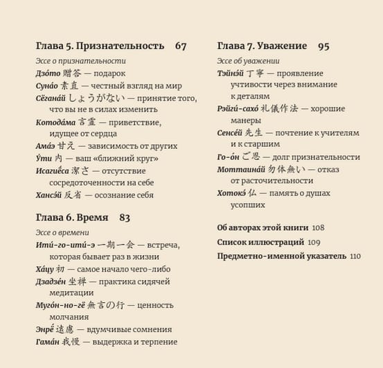 В книге лингвиста Мари Фудзимото рассказывается о 43 базовых ценностях японской культуры, которые помогают понять себя, стать ближе к природе, примириться с течением времени и улучшить отношения с близкими. Среди этих понятий есть и широко известные, например кайдзен, ваби-саби, икигай, и практически незнакомые нам хансэй, сунао, сибуи и многие другие. Текст дополняют хайку великого Мацуо Басё, поэтические эссе влюбленного в Японию южноафриканца Дэвида Баклера и работы признанного мастера черно-белой фотографии Майкла Кенны.