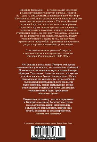 «Ярмарка Тщеславия» — не только самый известный роман викторианского писателя Уильяма Теккерея, но и одно из самых читаемых произведений во всем мире. На страницах этой книги разворачивается широкая панорама жизни Англии первой половины XIX века. Длинной вереницей проходят перед читателем люди разных социальных кругов: дельцы, аристократы, чиновники, члены парламента, помещики, военные, дипломаты, гувернантки, лакеи. Все они живут по законам «ярмарки», где все продается и все покупается, где всем правит успех и богатство. Следить за тем, как их судьбы переплетаются между собой, образовывая причудливые узоры и картины, чрезвычайно увлекательно.
