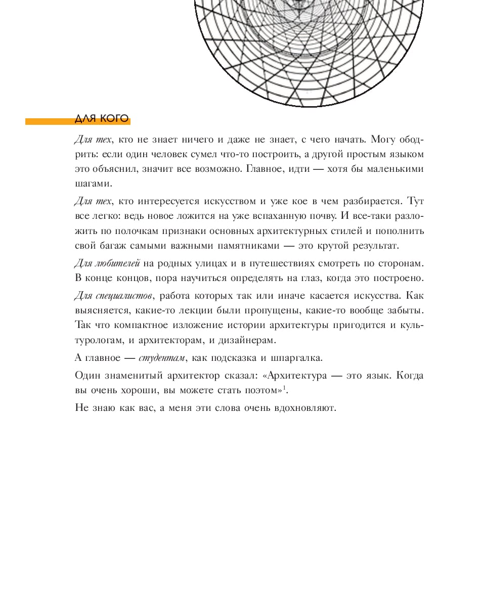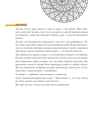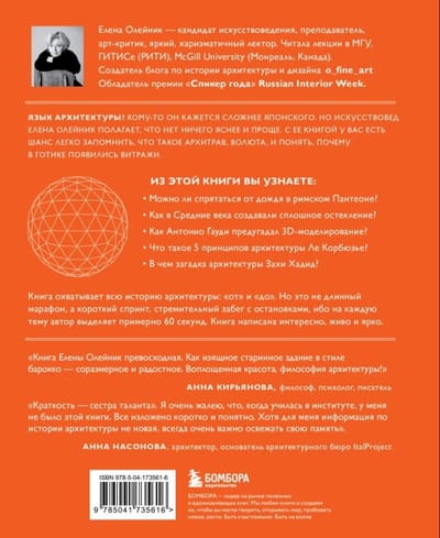 Понять архитектуру теперь стало еще проще: автор книги Елена Олейник, кандидат искусствоведения, преподаватель, арт-критик, яркий харизматичный лектор и обладатель премии «Спикер года» Russian Interior Week 2024, благодаря подробно структурированной информации поможет разобраться не только в стилях, направлениях и терминах, но и в том, как благодаря разнообразию архитектурных решений можно ближе познакомиться с разными периодами нашей истории. Богато иллюстрированное издание позволит глубже погрузиться в тему, научит отличать барокко и рококо, ответит на вопросы, чем прославились самые такие знаменитые архитекторы, как Заха Хадид и Ле Корбюзье, и можно ли спрятаться от дождя в Пантеоне. Именно здесь вы узнаете, как на смену суровости романтики приходит изысканность готики и как знание архитектуры поможет нам увидеть цикличность истории.