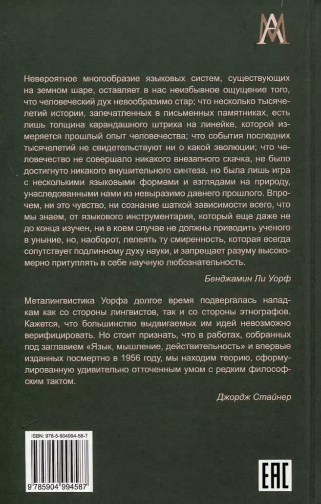 Настоящее издание — перевод единственного, вышедшего уже после смерти автора сборника его работ «Язык, мышление, действительность». В него входят статьи как на общелингвистические темы, так и специальные исследования языков хопи, шони, письменности майя, а также долгое время лежавший в архивах «Йельский доклад» — смелая попытка Уорфа наметить универсальную схему языковедческого исследования.