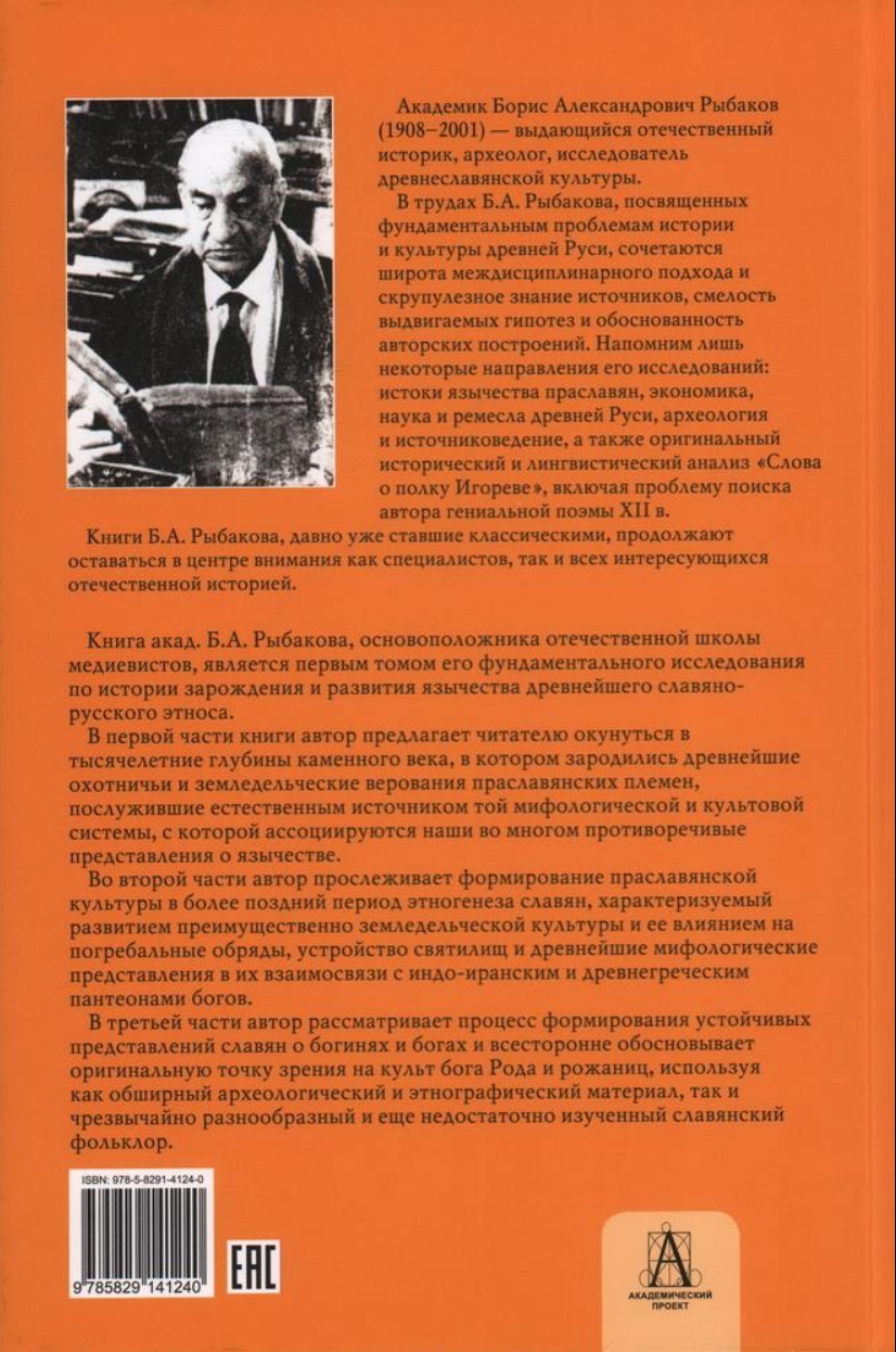 Книга принадлежит перу выдающегося историка и археолога, знатока культуры древней и средневековой Руси акад. Б.А. Рыбакова, основоположника отечественной школы медиевистов, и является первым томом его фундаментального исследования по истории зарождения и развития язычества древнейшего славянорусского этноса.
