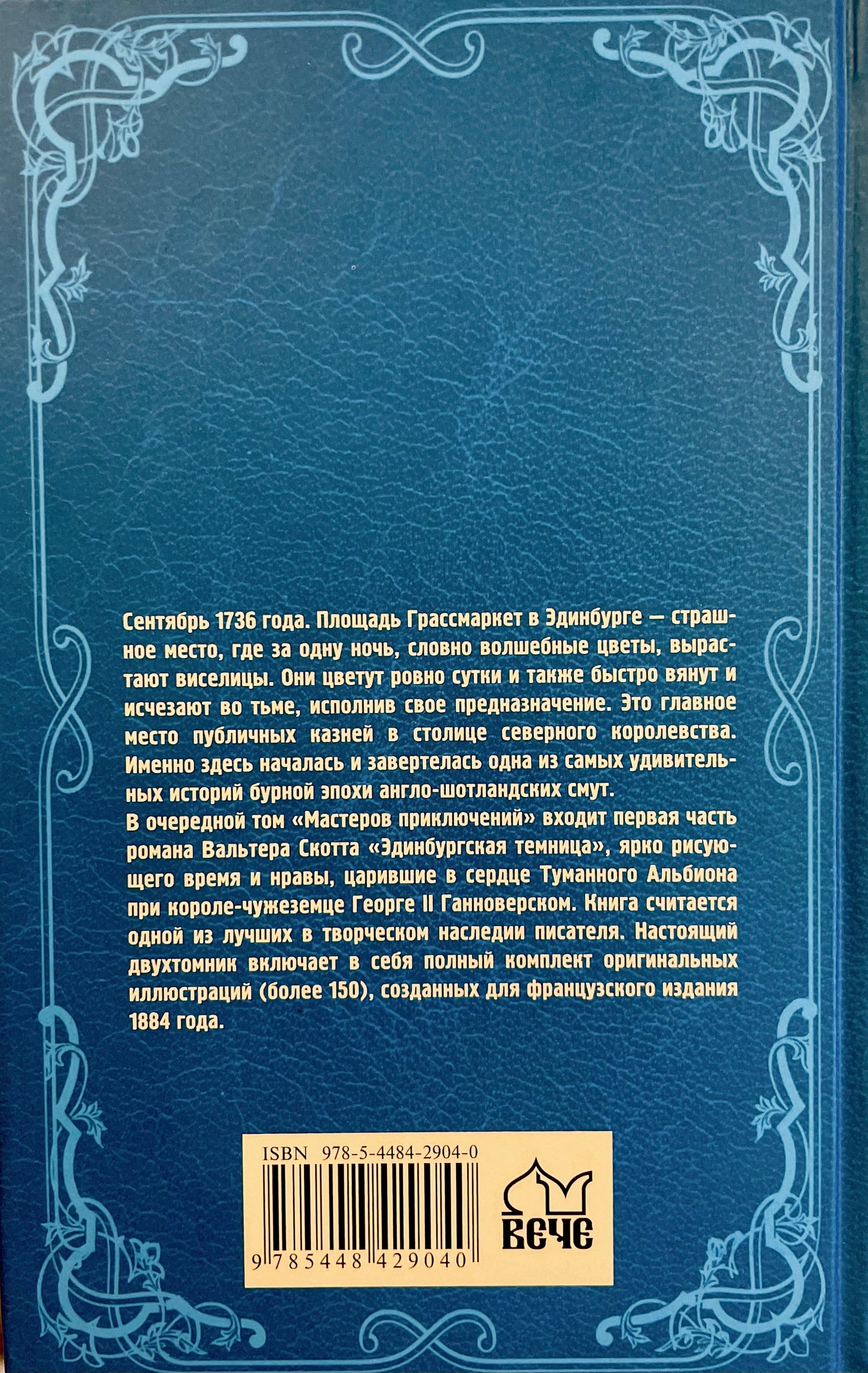 Сентябрь 1736 года. Площадь Грассмаркет в Эдинбурге — страшное место, где за одну ночь, словно волшебные цветы, вырастают виселицы. Они цветут ровно сутки и также быстро вянут и исчезают во тьме, исполнив свое предназначение. Это главное место публичных казней в столице северного королевства. Именно здесь началась и завертелась одна из самых удивительных историй бурной эпохи англо-шотландских смут. В очередной том «Мастеров приключений» входит первая часть романа Вальтера Скотта «Эдинбургская темница», ярко рисующего время и нравы, царившие в сердце Туманного Альбиона при короле-чужеземце Георге II Ганноверском. Книга считается одной из лучших в творческом наследии писателя. Настоящий двухтомник включает в себя полный комплект оригинальных иллюстраций (более 150), созданных для французского издания 1884 года.