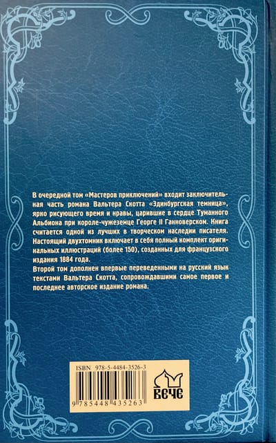 В очередной том «Мастеров приключений» входит заключительная часть романа Вальтера Скотта «Эдинбургская темница», ярко рисующего время и нравы, царившие в сердце Туманного Альбиона при короле-чужеземце Георге II Ганноверском. Книга считается одной из лучших в творческом наследии писателя. Настоящий двухтомник включает в себя полный комплект оригинальных иллюстраций (более 150), созданных для французского издания 1884 года.