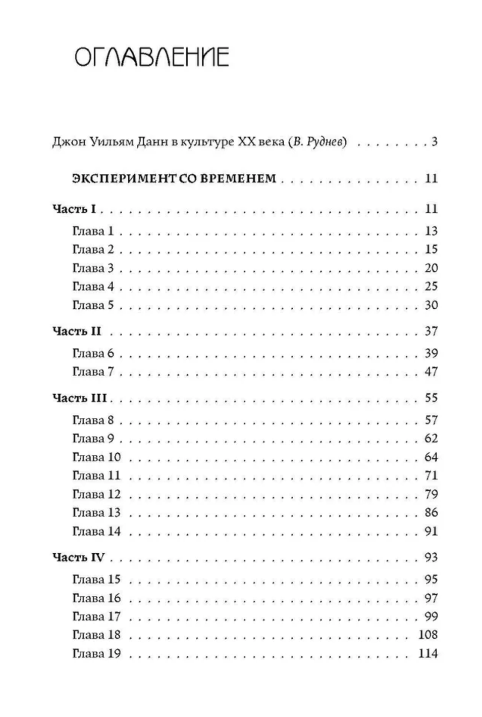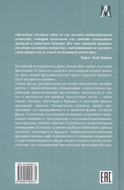 Теория Данна, разработанная на основе многолетних экспериментов с прекогнитивными сновидениями и искусственно вызванными прекогнитивными состояниями, заключается в том, что в реальности все времена присутствуют вечно — иначе говоря, прошлое, настоящее и будущее, в некотором смысле, происходят «вместе». Человеческое сознание, однако, воспринимает эту одновременность в линейной форме. Согласно Данну, в состоянии сна восприятие времени утрачивает непреложную линейность, присущую ему в состоянии бодрствования; как следствие, человек обретает способность к прекогнитивным сновидениям, в которых сознание свободно пересекает границы прошлого, настоящего и будущего. Книга Данна предназначена философам и филологам, психологам и культурологам, писателям и поэтам.