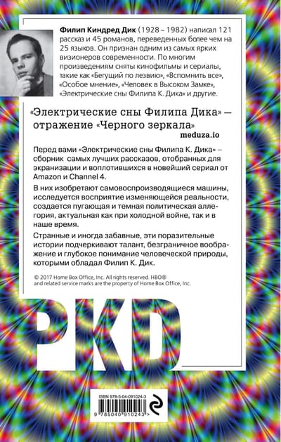 Перед вами «Электрические сны Филипа К. Дика» — сборник самых лучших рассказов, отобранных для экранизации и воплотившихся в новейший одноименный сериал от Amazon и Channel 4, спродюсированный Брайаном Крэнстоном («Во все тяжкие»). В них изобретают самовоспроизводящиеся машины, исследуется восприятие изменяющейся реальности, создается пугающая и темная политическая аллегория, актуальная как при Холодной Войне, так и в наше время. Странные и иногда забавные, эти поразительные истории подчеркивают талант, безграничное воображение и глубокое понимание человеческой природы, которыми обладал Филип К. Дик.