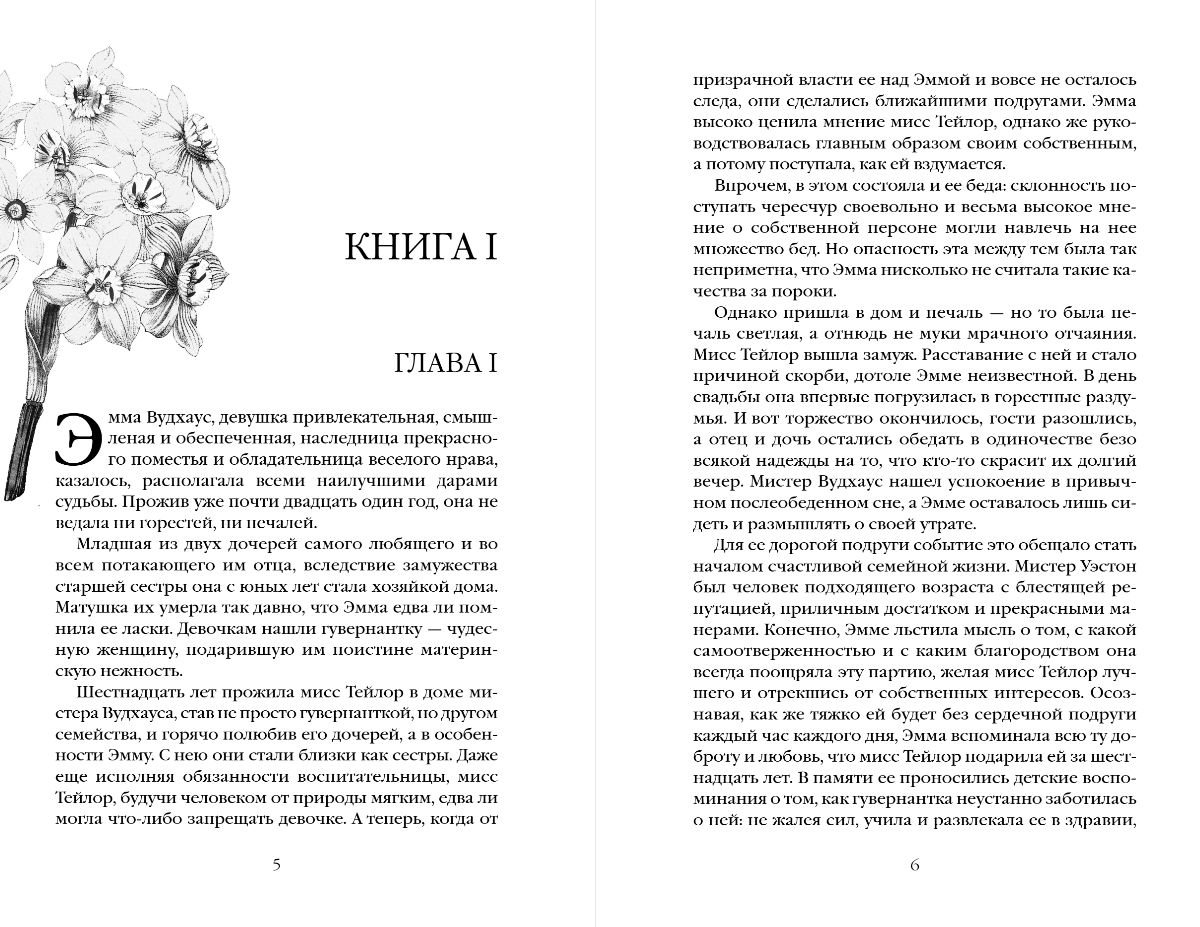 «Эмма» — самое едкое, самое точное и саркастичное из произведений писательницы, оно же — последнее, увидевшее свет при ее жизни. Эта история достаточно нетипичная: героиня не бедна, у нее все есть — хороший дом, любящий отец, состояние, нет только мужа. Но она и не торопится замуж, предпочитая устраивать судьбы своих подруг и знакомых и тем самым порой попадая впросак. При этом, занимаясь чужой личной жизнью, Эмма чуть не проглядела собственное счастье…