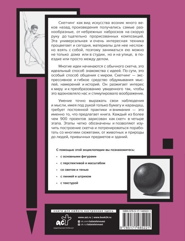 Многие идеи начинаются с обычного скетча, это идеальный способ воплощения идеей, экспрессивное и гибкое средство обдумывания мыслей, намерений и историй. Умение точно и емко выражать наблюдения и мысли, имея под рукой только бумагу и карандаш, требует постоянной практики и внимания. Эта книга поможет вам с легкостью научиться создавать любой скетч. Для более удобного усвоения материала 900 сюжетов зарисованы эскизами в четыре ключевых этапа, каждый из которых четко обозначен и позволяет изучить построение скетча и потренироваться. Для наработки этапов крайне важно не разбирать один конкретный сюжет, а поработать со многими темами, от животных и природы до людей, привычных предметов и зданий. По мере того, как вы совершенствуетесь и приобретаете уверенность, разносторонний навык изображения разных контуров, поверхностей и масштабов позволит вам претворять идеи и образы в жизнь. Книга нацелена на решение этой задачи, и здесь вы найдете все необходимое — от обзора основных инструментов и техник до способов сформировать большой запас навыков. Вы овладеете такими темами, как основные фигуры, перспектива и масштаб, свет и тень, линия и штрих, текстура. И даже будете обладателями целой библиотеки текстур!