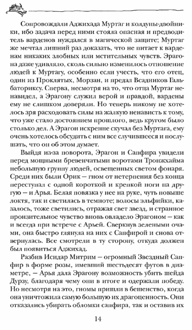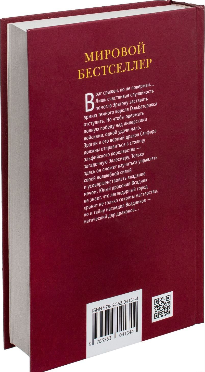 2-я книга тетралогии. Враг сражен, но не повержен... Лишь счастливая случайность помогла Эрагону заставить армию темного короля Гальбаторикса отступить. Но чтобы одержать полную победу над имперскими войсками,одной удачи мало. Эрагон и его верный друг дракон Сапфира должны отправиться в столицу эльфийского королевства - загадочную Эллес- меру. Только здесь он сможет найчиться управлять своей волшебной силой и усовершенствовать владение мечом. Юный драконний Всадник не знает, что легендар- ный город хранит не только секреты мастерства, но и тайну наследия Всадников - магический дар драконов...
